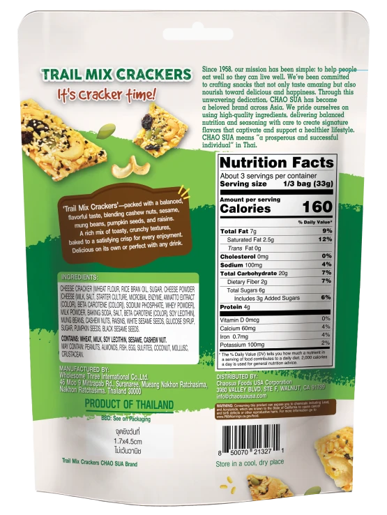 'Trail Mix Crackers'--packed with a balanced, flavorful taste, blending cashew nuts, sesame, mung beans, pumpkin seeds, and raisins. A rich mix of toasty, crunchy textures, baked to a satisfying crisp for every enjoyment. Delicious on its own or perfect with any drink.
