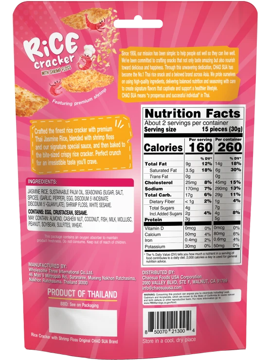 Crafted the finest rice cracker with premium Thai Jasmine Rice, blended with shrimp floss and our signature special sauce, and then baked to the bite-sized crispy rice cracker. Perfect crunch for an irresistible taste you'll crave.