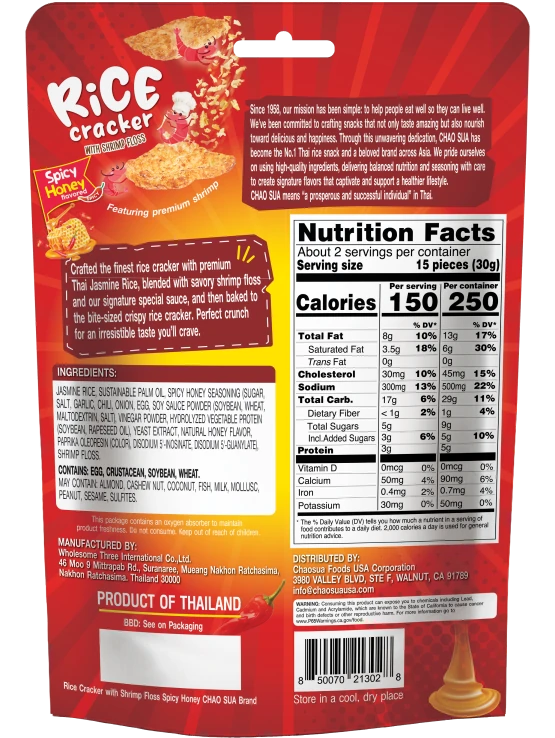 Crafted the finest rice cracker with premium Thai Jasmine Rice, blended with shrimp floss and our signature special sauce, and then baked to the bite-sized crispy rice cracker. Perfect crunch for an irresistible taste you'll crave.