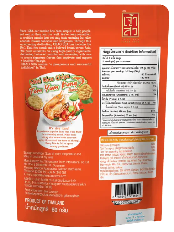 Experience popular Thai Tom Yum Kung in a crunchy snack. Made from sticky rice mixed with sour and spicy flavor (and the taste of shrimp). Every bite is full of spicy, savory goodness.