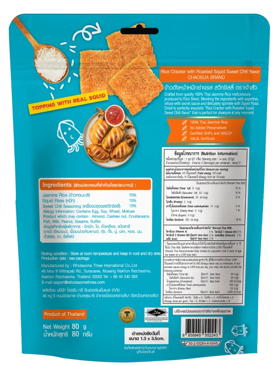 "Since 1958, CHAO SUA has been crafting rice crackers from premium 100% Thai Jasmine Rice meticulously transformed into Rice Sheets. Expertly blended, coated with a special sauce, and delicately sprinkled with Squid Floss, our 'Rice Cracker with Roasted Squid Sweet Chili' is baked to perfection, ideal for enjoyment at any moment".